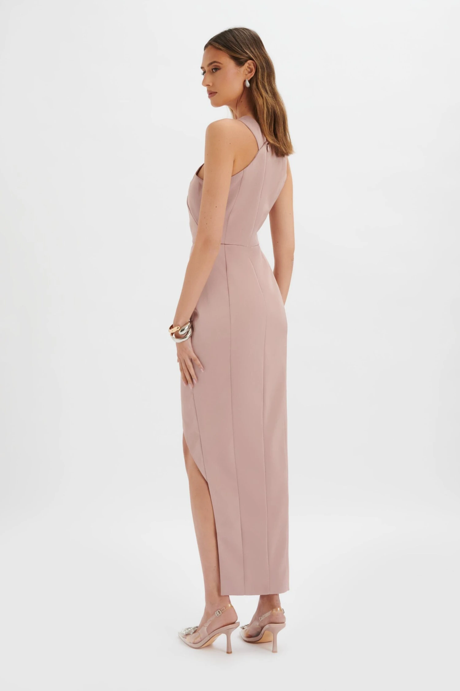Designed to make you feel elegant and gorgeous on the big day, the MADELINE gown is expertly cut from the prettiest dusty purple satin. The cross front detailing gives the illusion of a smaller silhouette and delicate pleats enhance your waist. Pair with barely there accessories for an opulent finish.